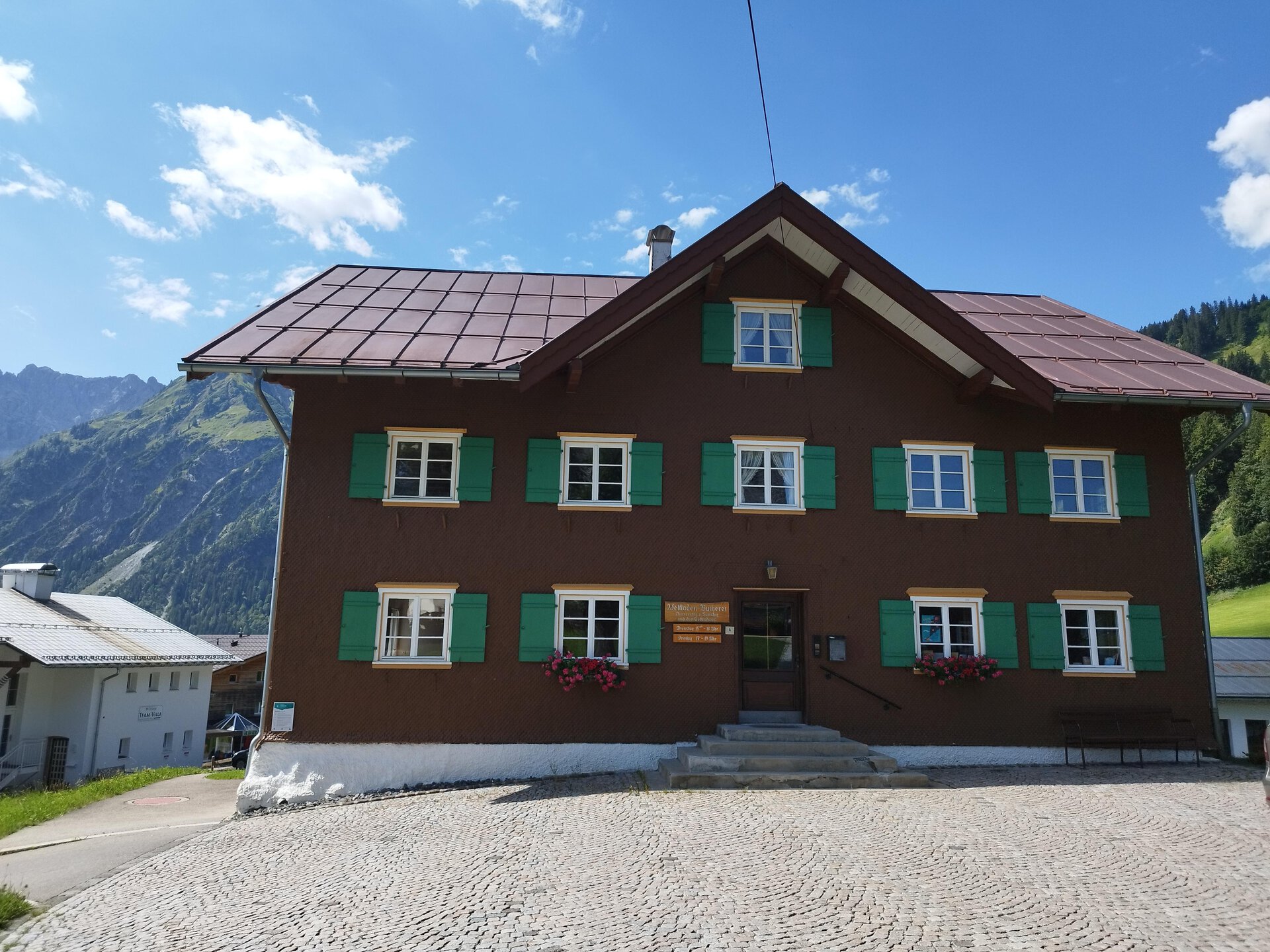 Ein traditionelles altes Haus mit brauner Fassade und grünen Fensterläden. Im Hintergrund sind Berge und ein blauer Himmel sichtbar. | © Kleinwalsertal Tourismus | Nicole Lughammer