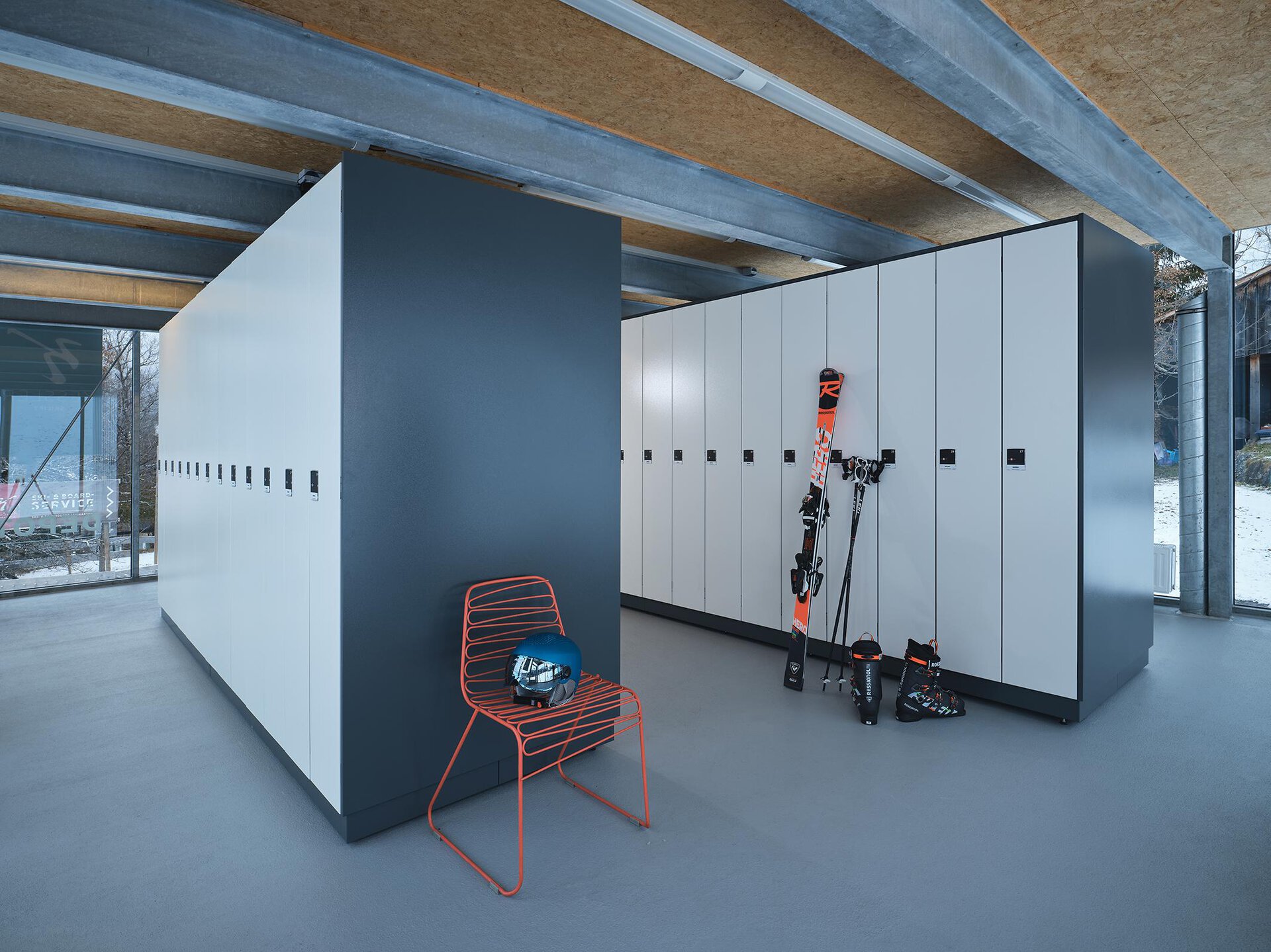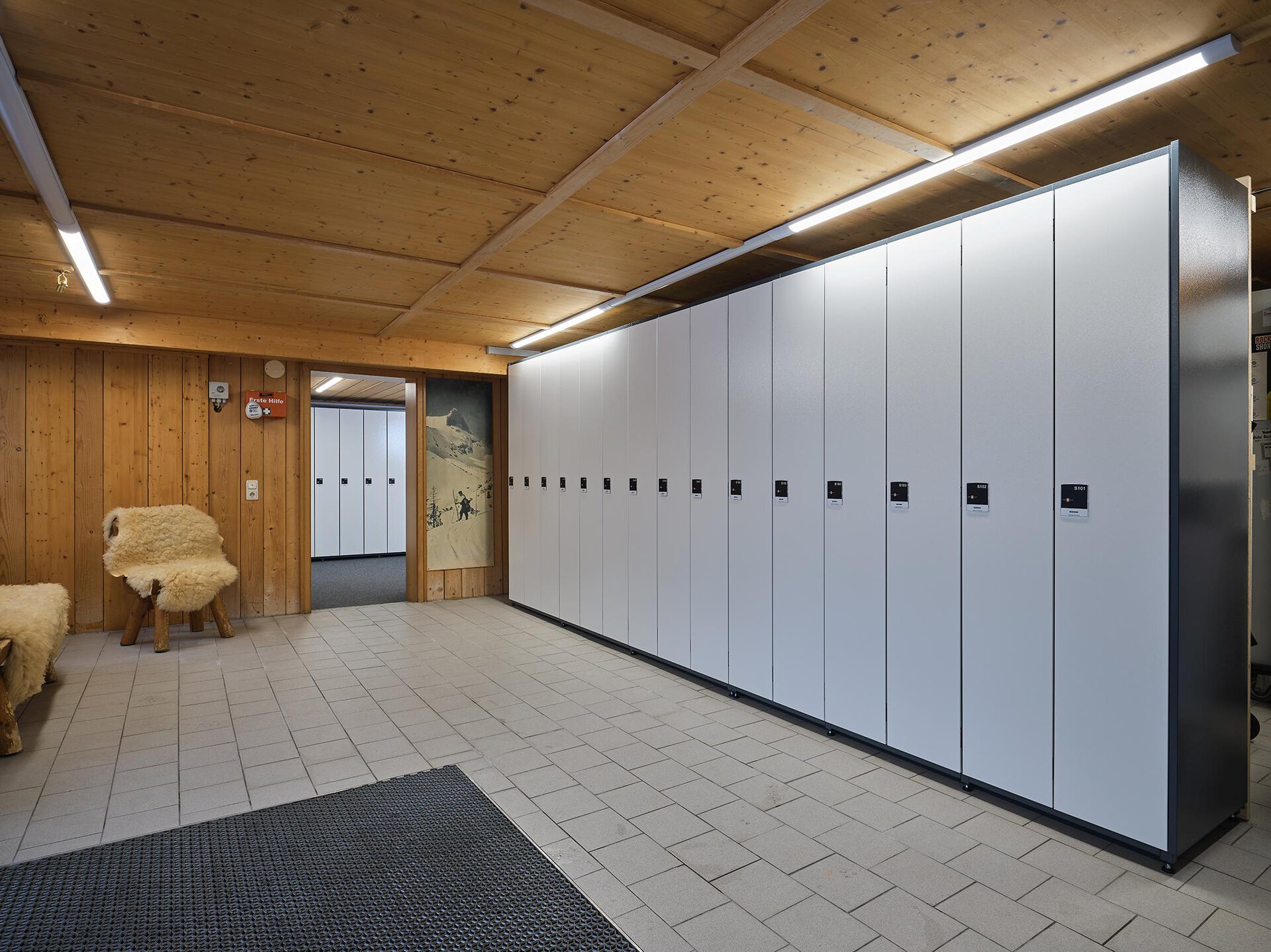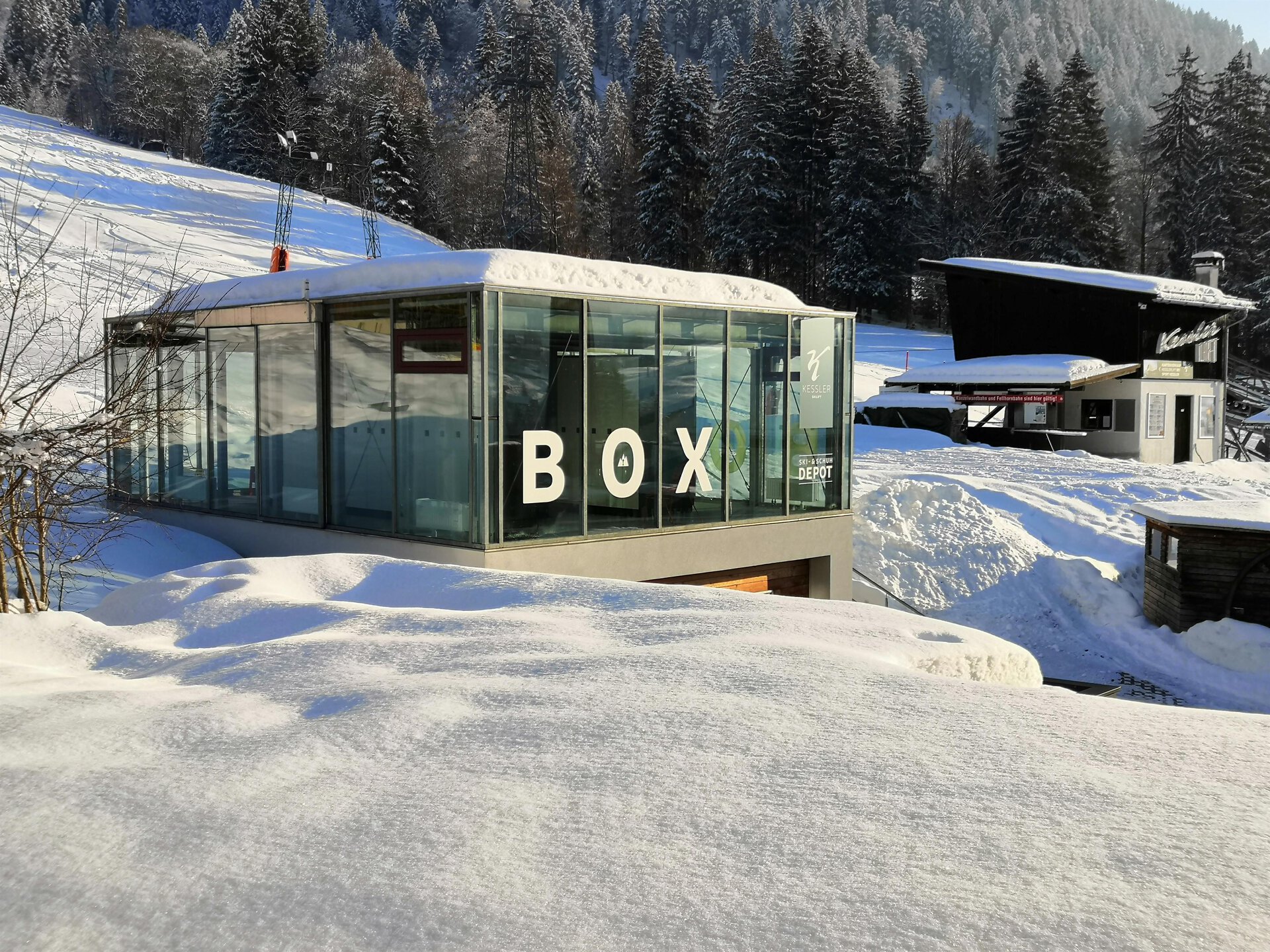 Depot für Ski, Snowboard und Schuhe. Talstation "Kessler Lift bei der Kanzelwandbahn" - in der markanten Glas-Box und der Box 2 bei der Service Werkstatt. Die beheizten Selbstbedienungskästen bieten Platz für 2 Paar Ski / Boards und 2 Paar Schuhe.