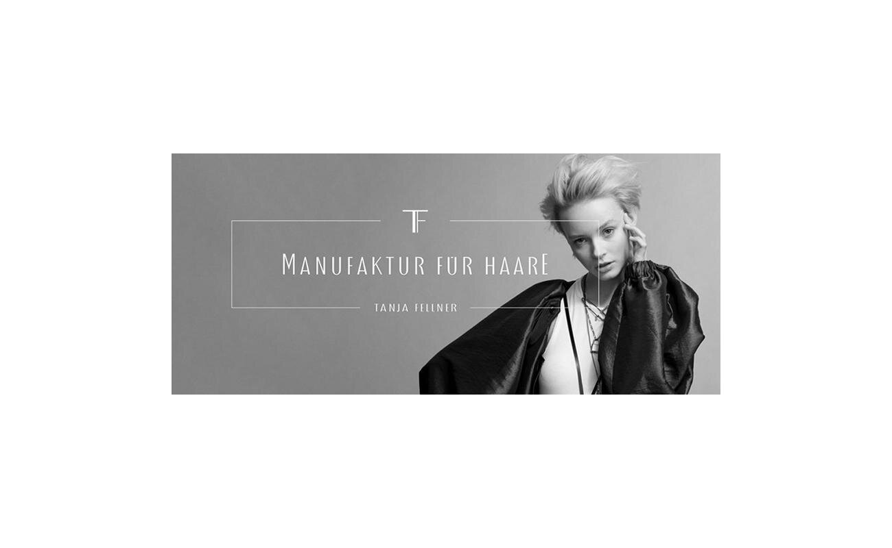Ein modernes, schwarzes und weißes Bild mit einer Frau, die stilvolle Kleidung trägt. Der Text „Manufaktur für Haare“ und „Tanja Heilmer“ sind sichtbar. | © TF Tanja Fellner Manufaktur für Haare Logo
