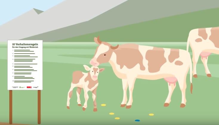 Suckler cows instinctively defend their calves and can react aggressively when approached. Dogs in particular trigger a protective instinct in them, which is why direct encounters should be avoided. Keep your distance and always keep dogs on a lead.