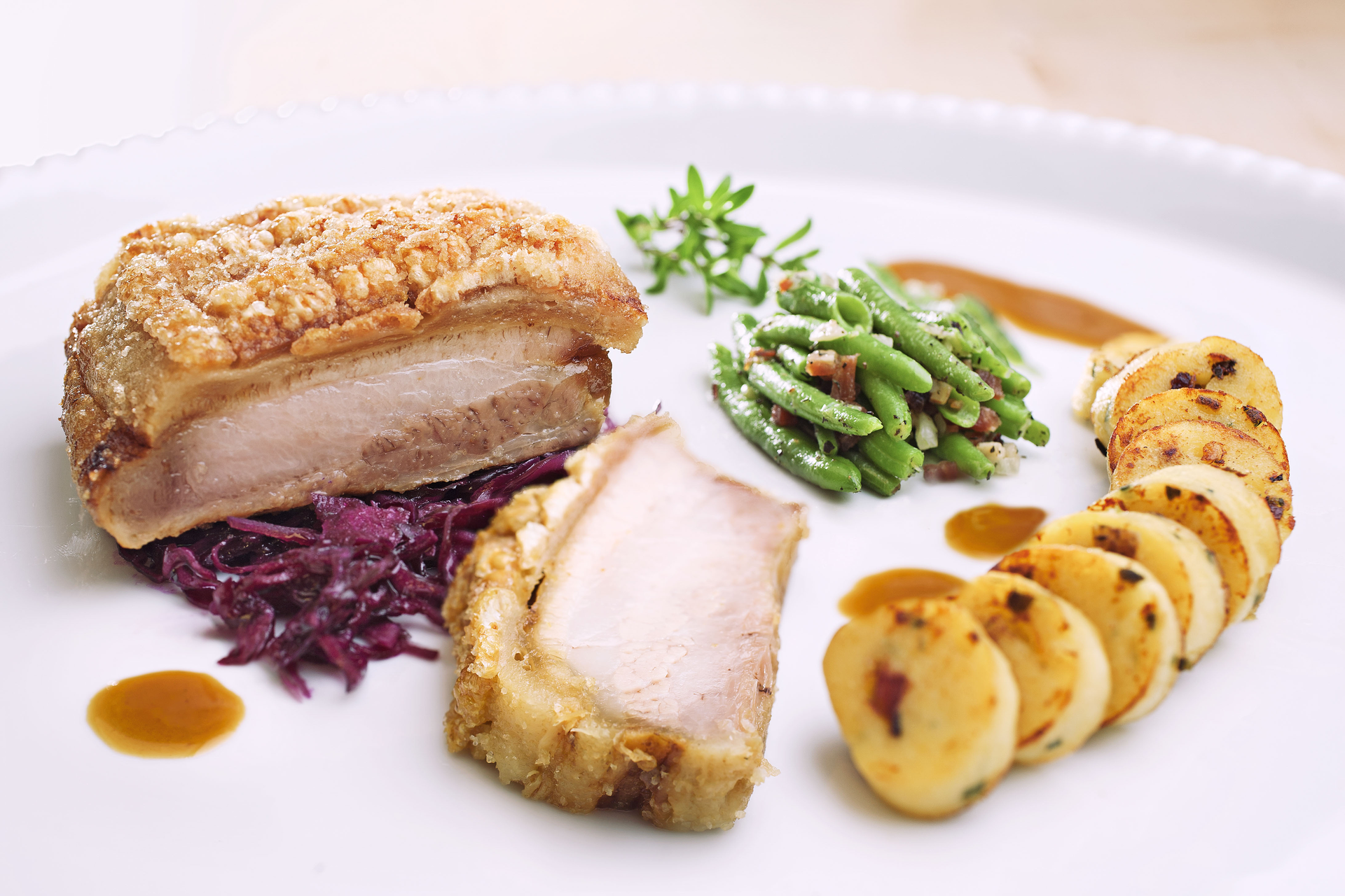 Peel the root vegetables, chop evenly (leave the garlic cloves whole) and fry lightly in clarified butter in a roasting tin. Deglaze with the stock. Rub the meat well with salt all over, do not sear, just “bed” it on the vegetables and roast in a preheated oven at 150°C with the rind facing upwards on the bottom shelf for approx. 3.5 hours.