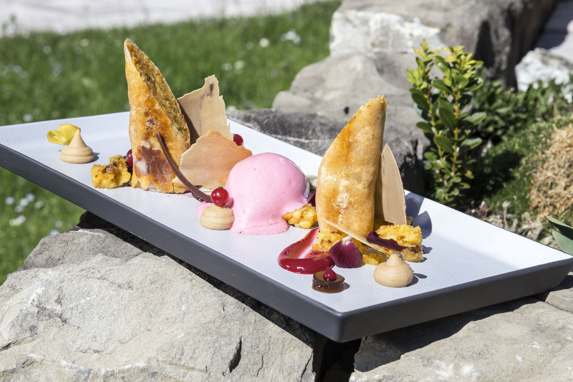 Lightly fry the butter and shallots in a pan, then add the corn semolina and deglaze with the white wine. Add the vegetable stock to the reduced mixture and then season with the grated mountain cheese, salt, pepper and nutmeg. Stir the Riebel until it becomes “crumbly” and finally brown it with the remaining butter.