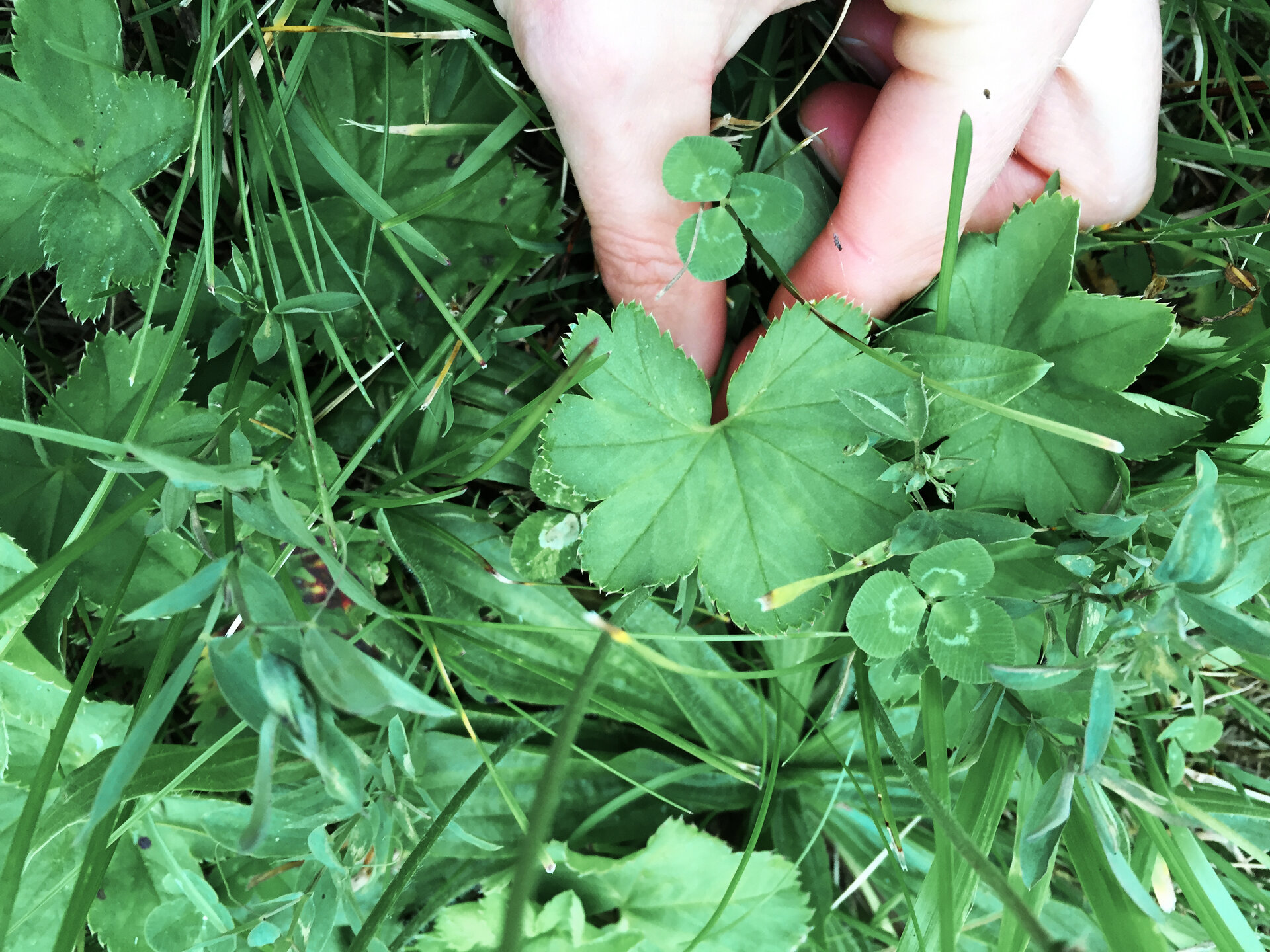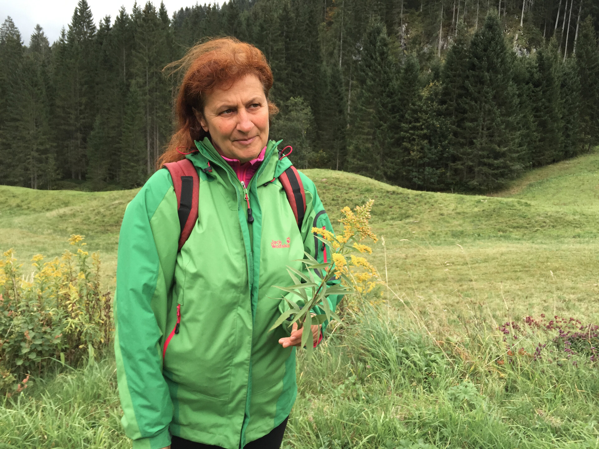 It gushes out of her for half an hour, and on the way to her herb workshop you can watch seven figures in colorful rainwear stumbling across the dry stream bed and wandering through the grass at the edge of the path. Then the bucket is full: we have all our ingredients together.