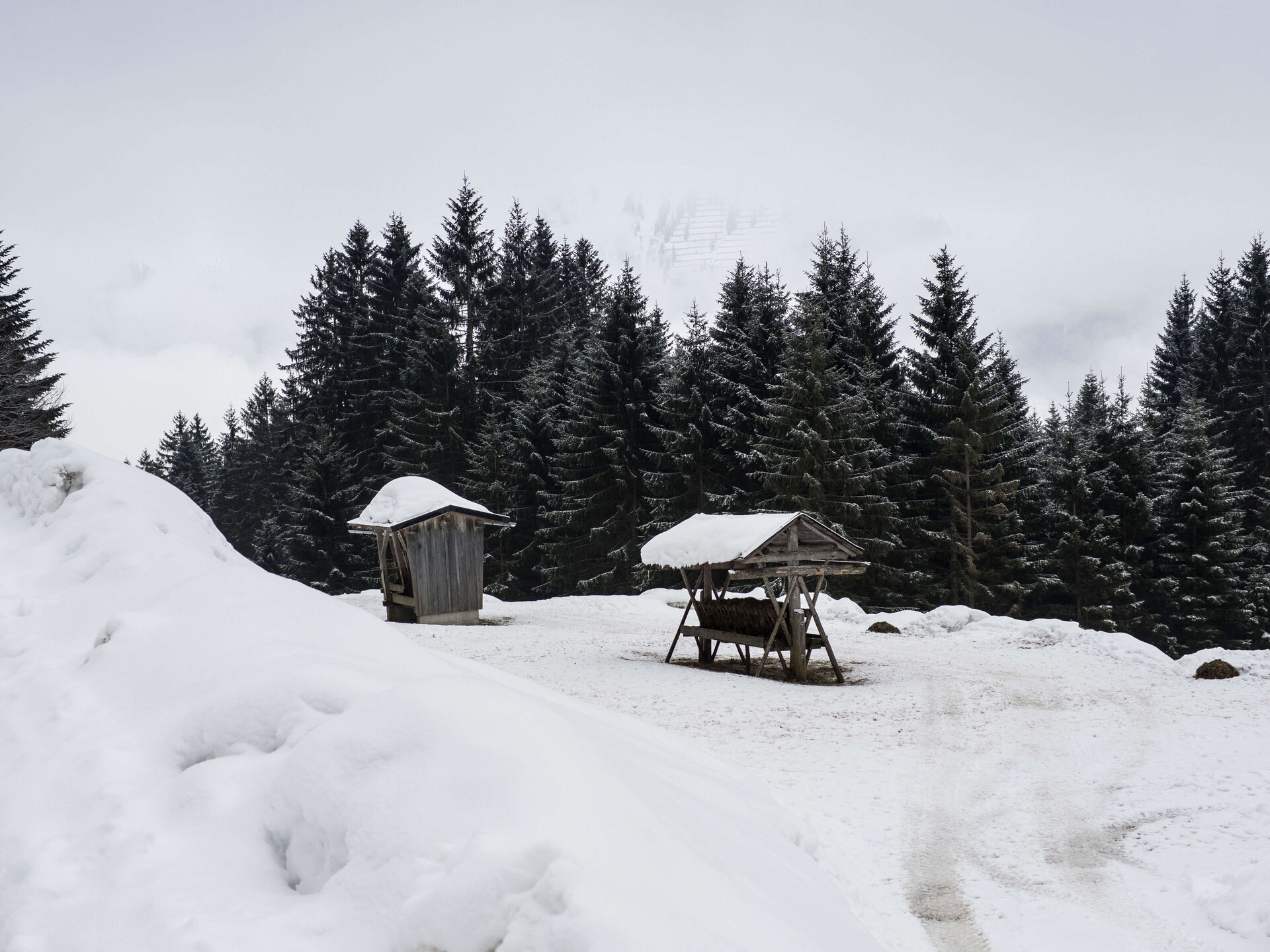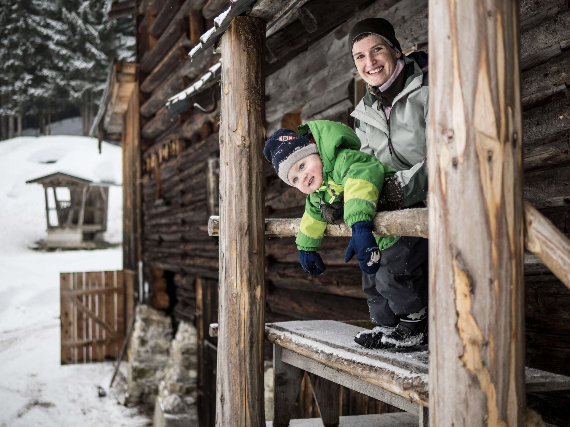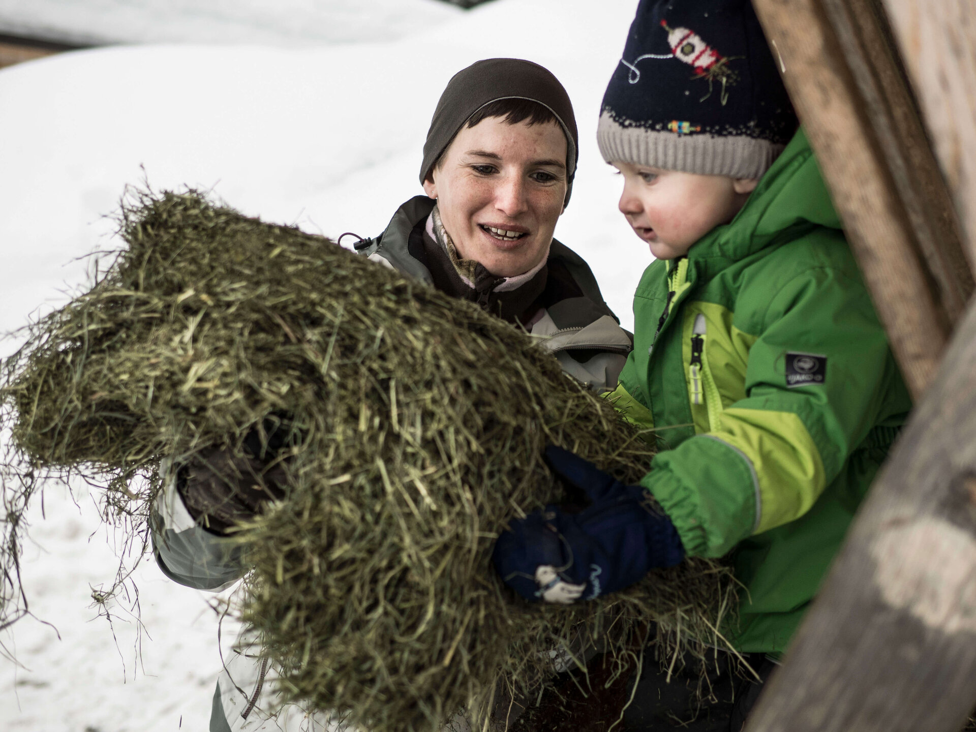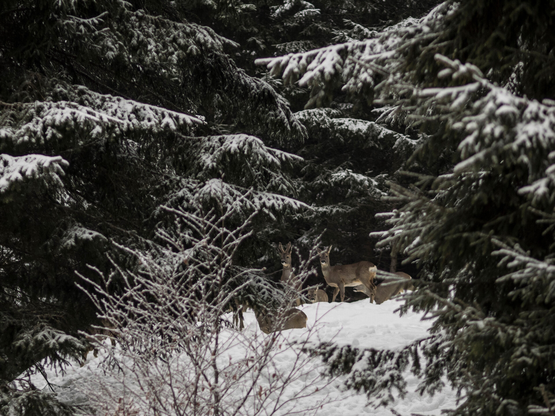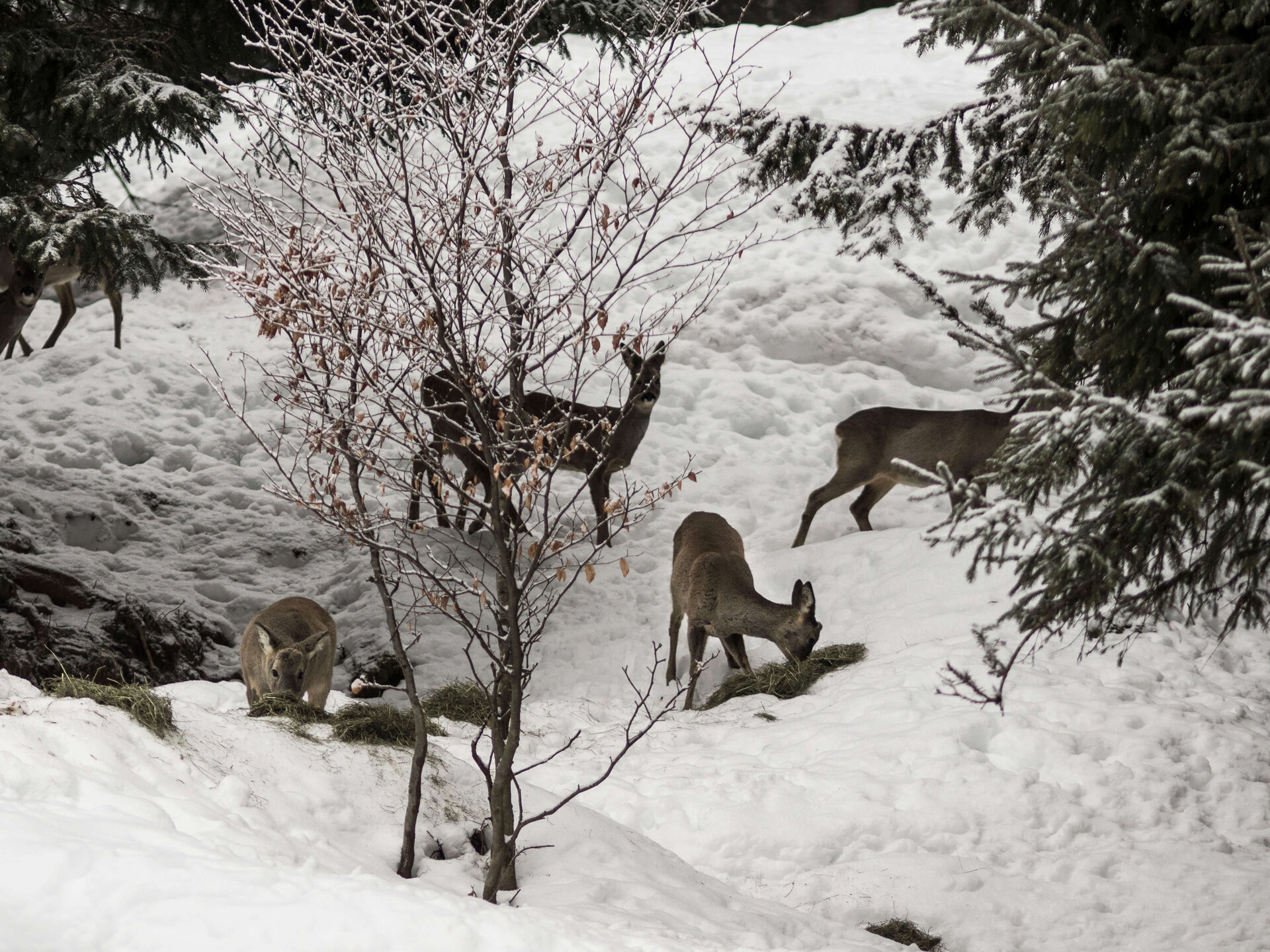 Josef, the little roaring fir tree, is really looking forward to being outside and claps his hands with delight. When they arrive at the game feeding area, Andi and his helper get straight to work. The feeding troughs have to be filled with delicious-smelling hay. In the meantime, we are supposed to have a little chat. Cathi draws my attention to tracks in the snow. “Look, it's the track of a deer," she explains. To me, it looked like a simple hole in the snow. It must be a magnificent animal, as deep as it reaches into the snow. Cathi draws me the typical tracks of a hare in the cold white and explains the elegant track line of a fox. I am thrilled.
