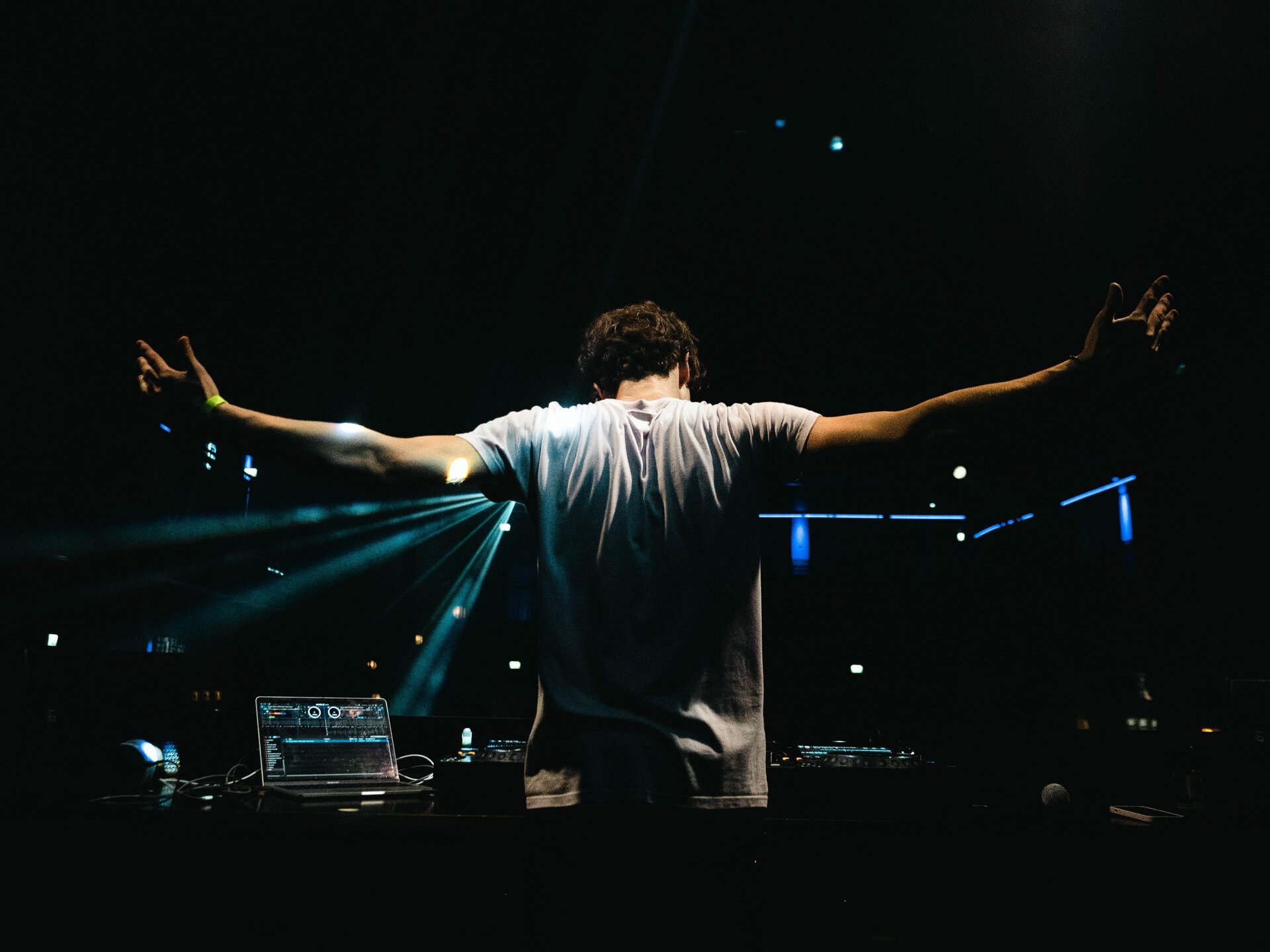 A DJ stands behind his mixing console with outstretched arms. Colorful lights shine in the background, creating a festive atmosphere. | © dj let´s fetz