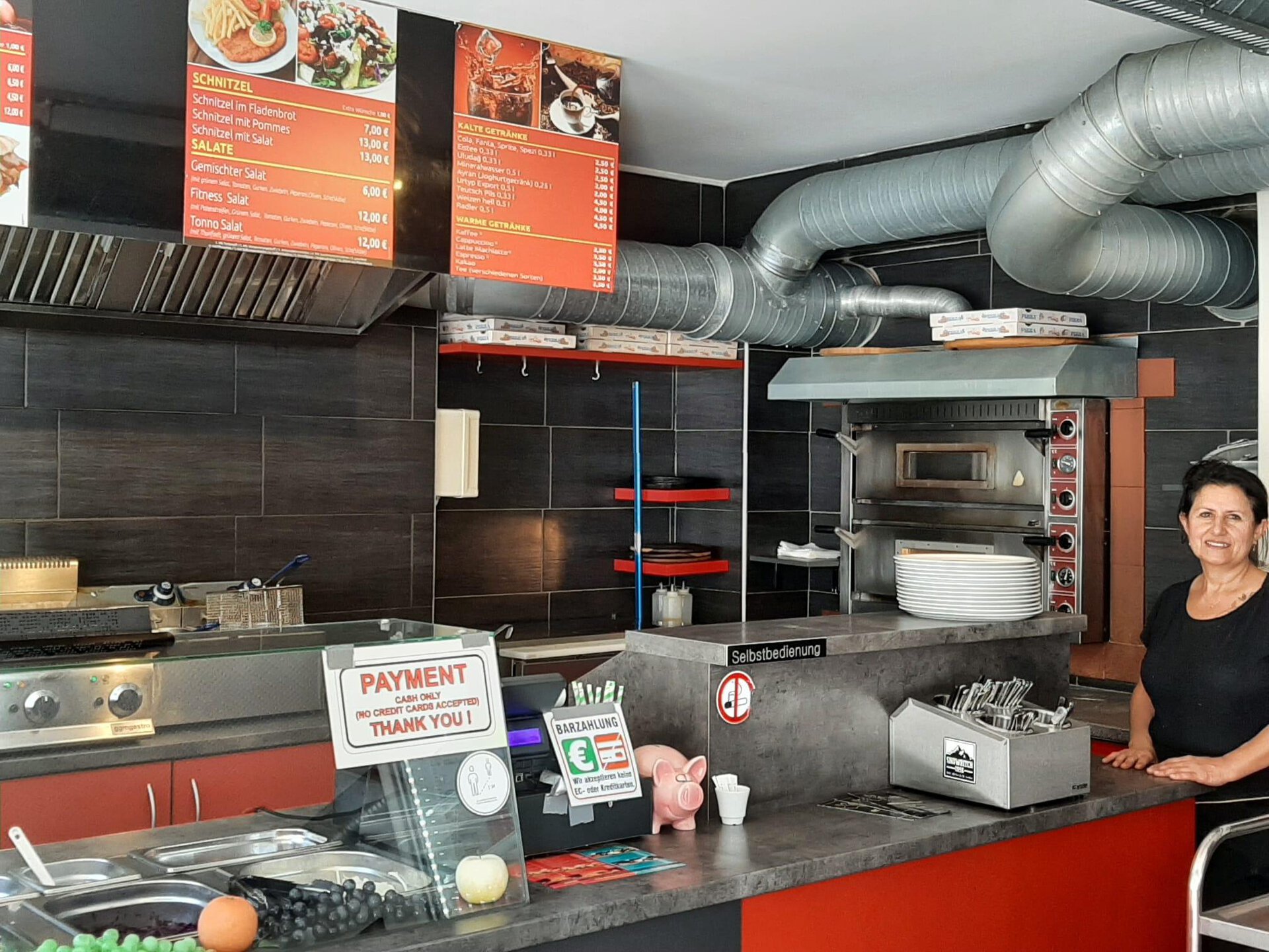 Doner kebabs, pizza, salads, currywurst, fries, cheeseburgers, all kinds of coffee.