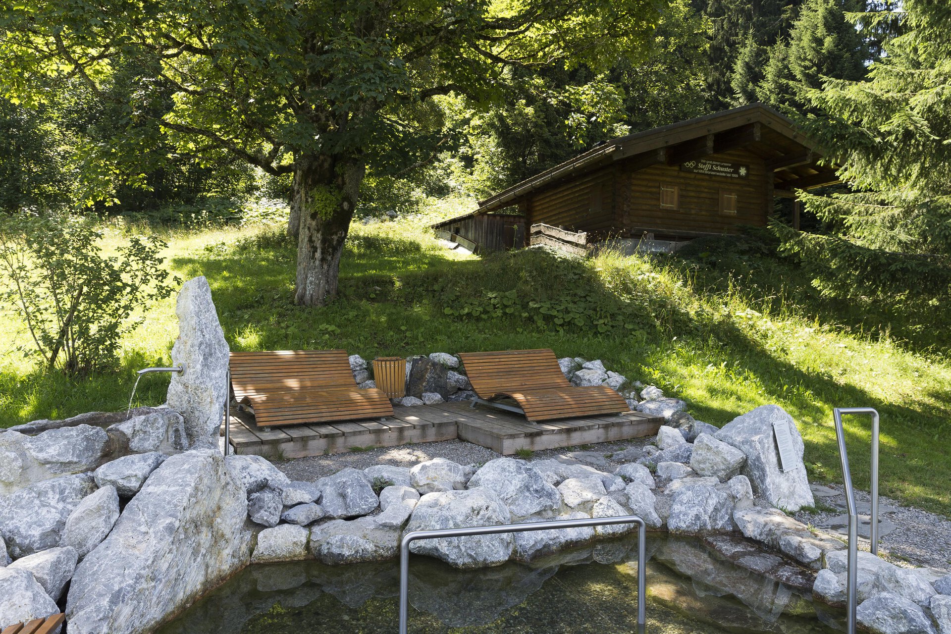 The Naturkneippbereich includes Wassertretbecken, a resting place with comfortable wooden couches, framed by a natural stone wall.