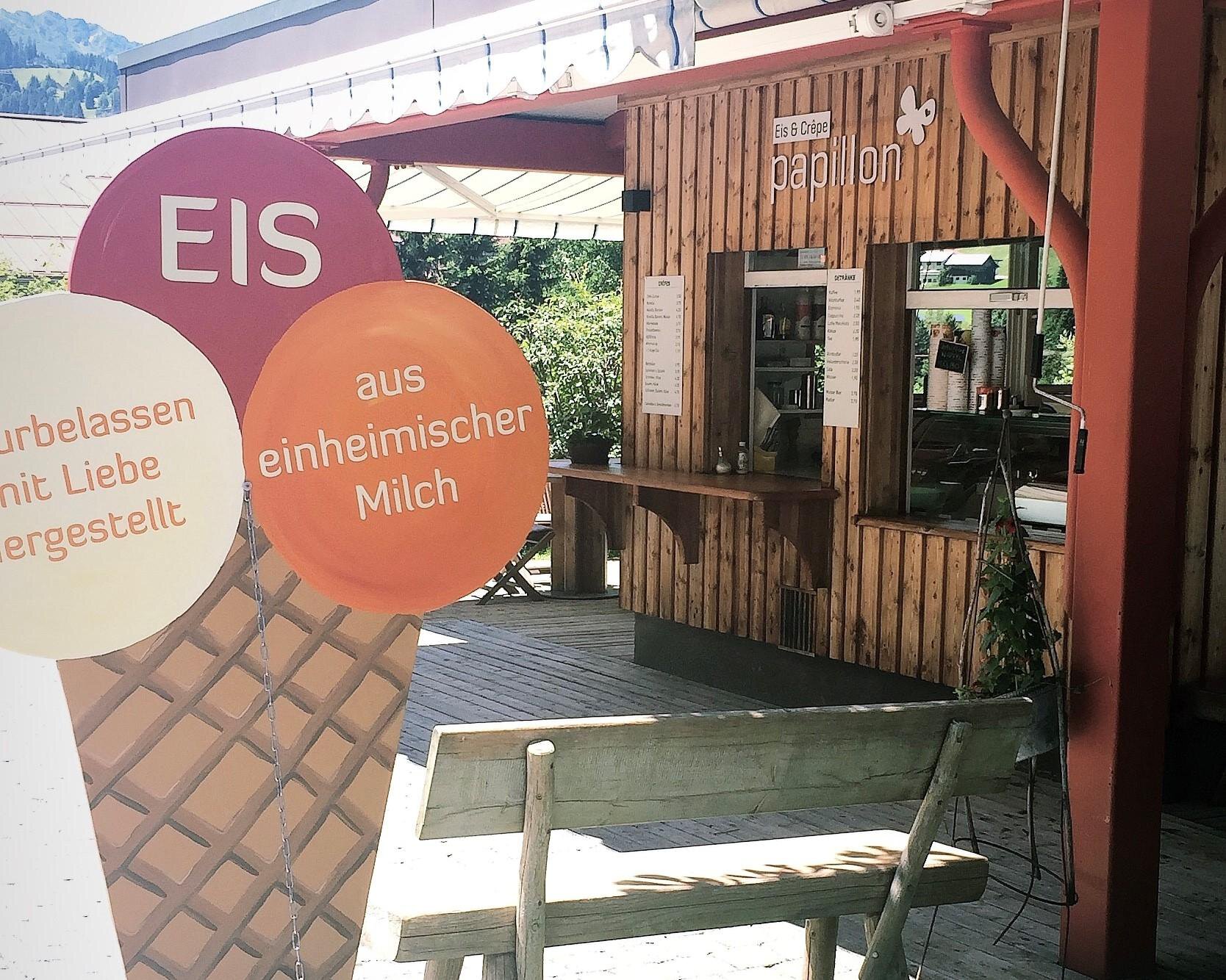 Ice cream made from natural ingredients & milk from local organic farmers in Kleinwalsertal, fresh crêpes, coffee, Aperol & more.