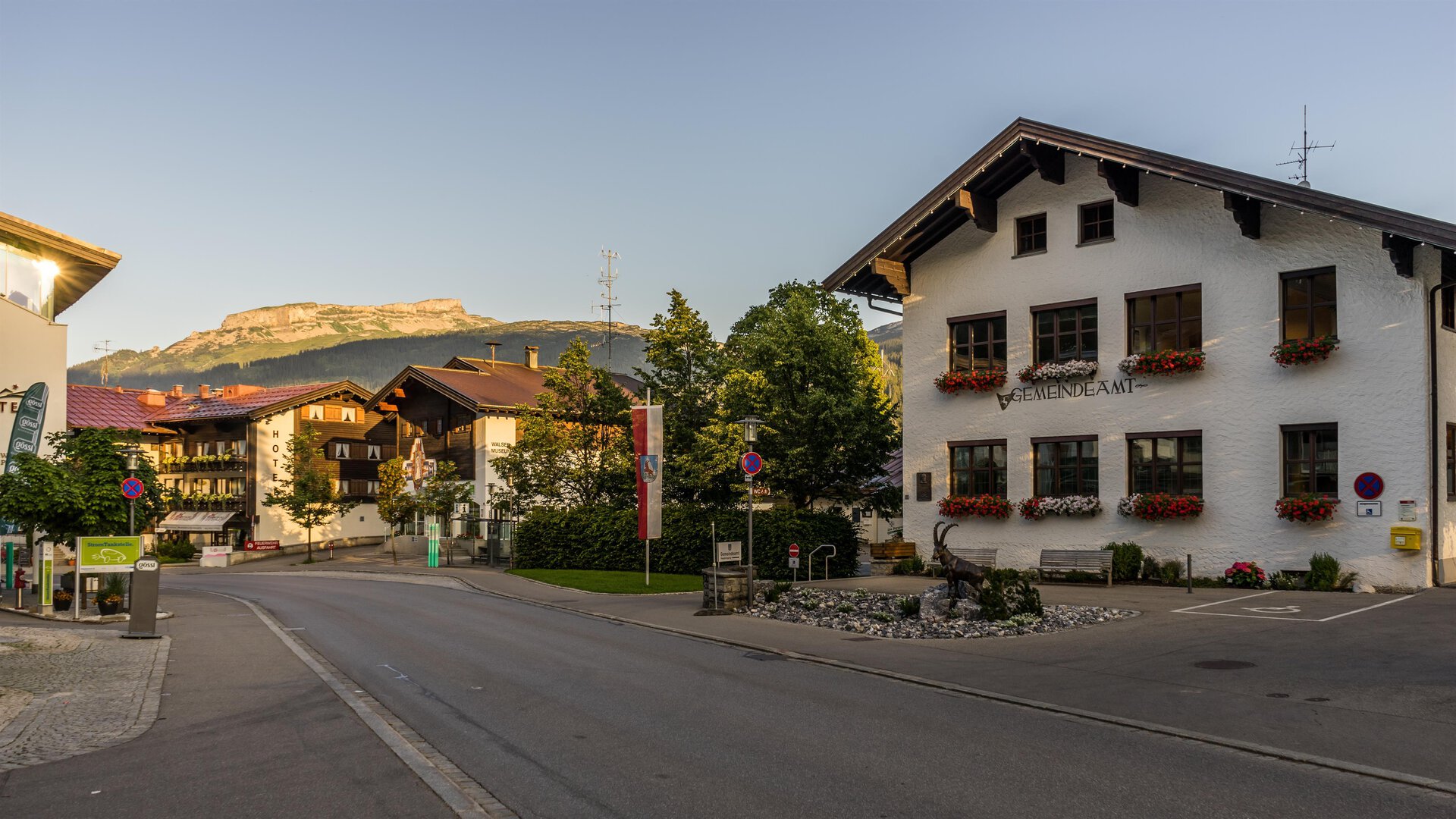 A quiet street with typical Bavarian houses and blooming windows. In the background, mountains are visible and the sky is clear. | © Kleinwalsertal Tourismus | Steffen Berschin